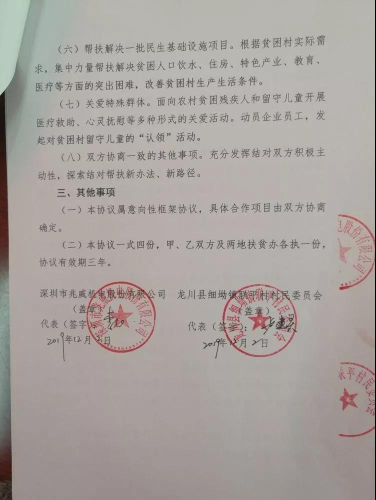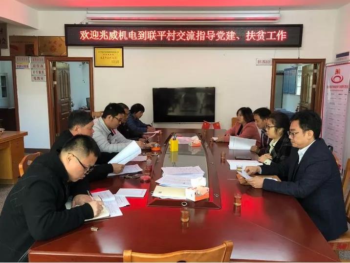 2019年12月4日,深圳市hjc黄金城官网机电股份有限公司党支部陈瑞哲书记、总经办李经理一行到河源市龙川县细坳镇联平村开展了村企结对帮扶和交流工作。期间,我司与村党委一是签订了村企结对帮扶框架协议并互换存底;二是召开会议互相交流双方党支部及基层基本情况,拟订未来一年的帮扶工作计划和具体措施;三是共同到细坳镇电商服务站联系首期合共2.8万元对口村贫困户的农产品消费扶贫采购工作;四是组织到村内参观村容村貌并到两户贫困户家中开展慰问访问和发放慰问品活动。